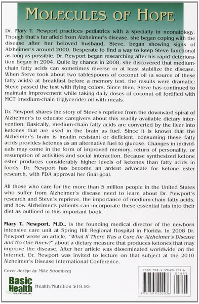 Though Dr. Mary T. Newport has provided professional care to newborns since 1983, she's led a double life since 2000 when she became a caregiver at home. That's when her beloved husband, Steve, first showed signs of Alzheimer's disease. After his deterioration accelerated in 2004, Dr. Newport began avidly researching ways to keep him functional for as long as possible. Since she understands medical terminology and scientific methods, she was thrilled to find new research showing that medium- chain fatty acids, which act like an alternative fuel in the insulin-deficient Alzheimer's brain, can sometimes reverse or at least stabilize the disease. When she gave Steve about 2 tablespoons of coconut oil (a source of these fats) at breakfast before a memory test that he had previously failed, Steve miraculously passed the test. Since then, Steve continues to maintain improvement while taking daily doses of coconut oil and MCT (medium-chain triglyceride) oil with meals. Dr. Newport's story of Steve's reprieve from Alzheimer's provides hope for caregivers eager to learn about readily available fatty acids in foods that may reverse the ravages of this dreaded disease. Changes in loved ones may take many forms, including improved memory, return of personality, resumption of activities and social interaction, and relief from certain physical symptoms. Because ketone esters, a synthesized form of these powerful fatty acids, work faster and more comprehensively than fatty acids in foods, Dr. Newport has become an ardent advocate for ketone ester research, with FDA approval her final goal. Caregivers for the more than 5 million people in the United States who suffer from Alzheimer's disease are searching desperately for hope, relief, and a cure. They will find all that in this book that summarizes Dr. Newport's research and Steve's reprieve, the importance of medium-chain fatty acids, and how Alzheimer's patients can make the transition to a healthy diet rich in these vital fats.