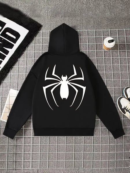 NEW Unisex Spider Print Y2K Gothic Harajuku Fleece-Lined Hoodie with Drop Shoulder Long Sleeves, Loose Fit Knit Polyester Zip-Up Hooded Jacket with Geometric Pattern for Fall/Winter, Sz L