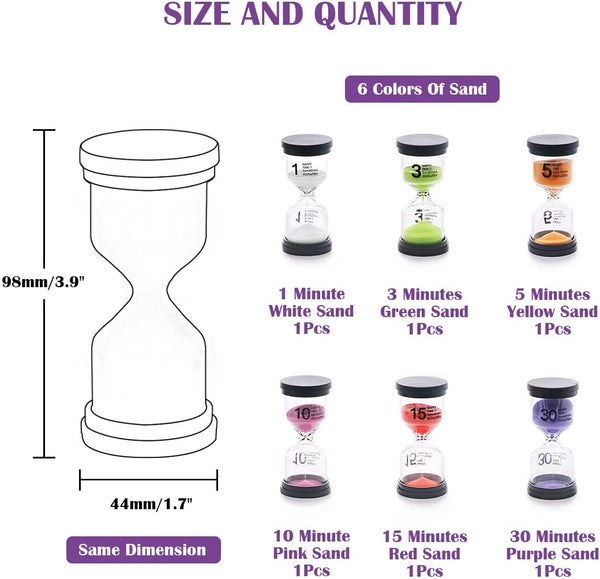 - 🌼 WHAT YOU GET ----- In this kit, you will get 6 Pack sand timer. This package includes six sand timers. A set of 1 minute, 3 minute, 5 minute, 10 minute, 15 minute, 30 minute timers. The color on both sides is different, the number is clear and easy to distinguish.