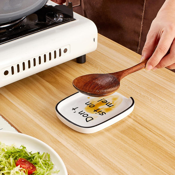 - Dimensions 4.8” W x 1.2” H. Spoon rest is a new idea of keeping your stovetop and countertop clean and neat. It is large enought to serve most of the spoons, spatulas, tongs,flatware,utensils and other kitchen tools.