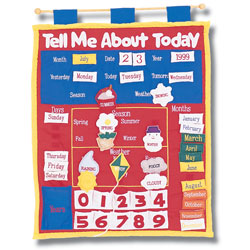 Tell Me About Today helps develop language and organizational skills. The velcro attachments allow kids to bring the calendar up to date. Available in four languages, this fun calendar is made of colorful, pretty, soft-padded cloth with an attached hanger cord. Measures 24" long x 18" wide.