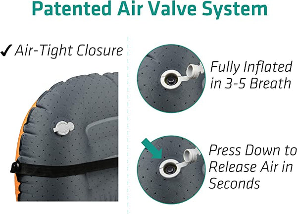 - Ease Of Use! With the simple click of a button, Inflate pillow by mouth with approximately 5-8 breaths. Once you are done you can conveniently deflate the pillow with the Quick Deflate feature which rapidly releases air after use in only seconds. With the unique technology in this compact and light camp pillow, you are able to adjust firmness to your personal sleep preference.