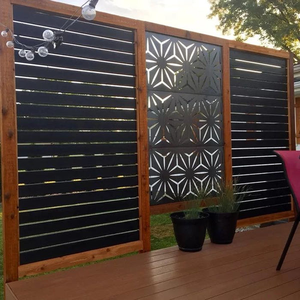 The Veradek Outdoor Partition Screen Set is inspired by traditional geometric patterns. They are modern, yet versatile, solid, yet lightweight, and include many privacy rating options. The outdoor room divider screen maintains your privacy, blocks direct sunlight, and is perfect for garden decor. Made from laser-cut corten steel, all screen panels are of the highest quality and are designed to resist corrosion through all seasons.