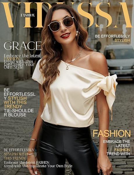 • Features: One Shoulder, Short Sleeve, Knot Bow, Office Work Satin Top. Soft fabric has some stretch.