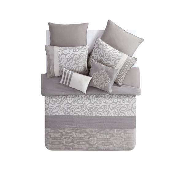 Instantly elevate your bedroom decor with this 8-Piece Floral Embroidered Rushed Bedding Comforter Set. A stunning addition to your master bedroom or guest bedroom, this sophisticated taupe bed set combines floral designs, abstract patterns, and pleated and embroidered accents on soft fabric with a lustrous sheen. This 8-piece bed set includes a comforter, shams, Euro shams, two decorative pillows, and a coordinating bed skirt to complete the look. This soft microfiber comforter set is machine washable. You can keep the set looking and feeling fresh by machine washing in cold water and drying on a w setting. Decorative pillows are spot clean only.