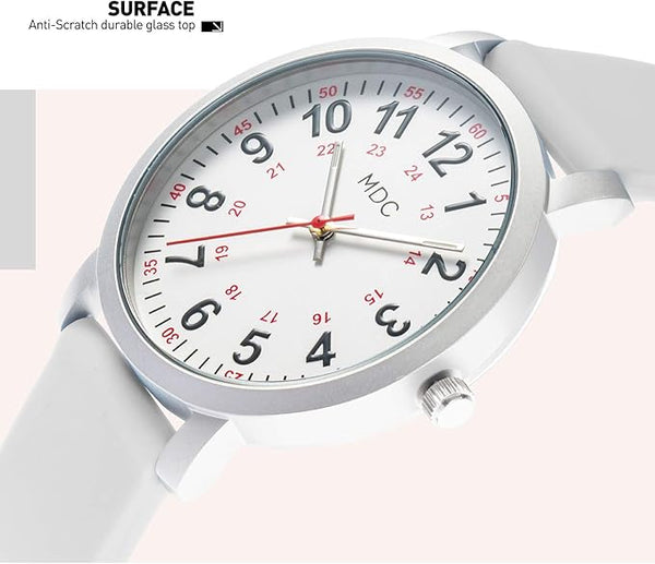 - Durability & Comfort: Our nurse watch is built for both durability and comfort, featuring a flexible and soft silicone watch band, surgical grade stainless steel case back, and mineral crystal glass. This combination ensures the watch is comfortable for long shifts and resilient against daily wear and tear, making it an essential accessory for medical professionals.