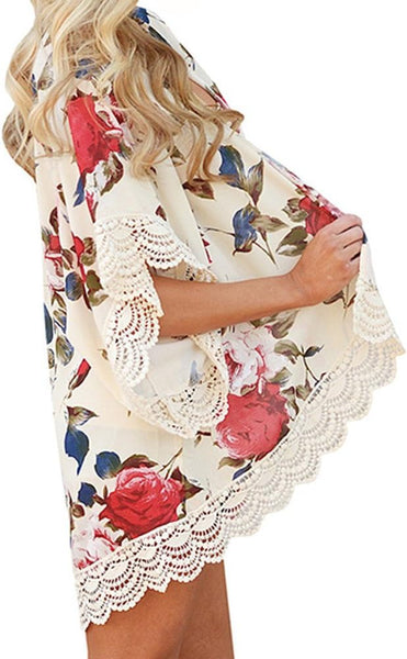 NEW Women Beachwear Cover Up Teen Girls Chiffon Kimono Cardigan Casual Floral Print Lace Bikini Swimsuit Blouse Tops Sz XL