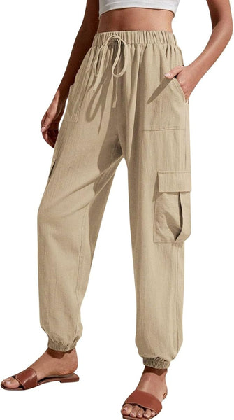 NEW Women Fashion Casual Solid Color High Waist Casual Pants Pocket Side Drawstring Hem Casual Pants Women Elastic, Khaki, Sz L