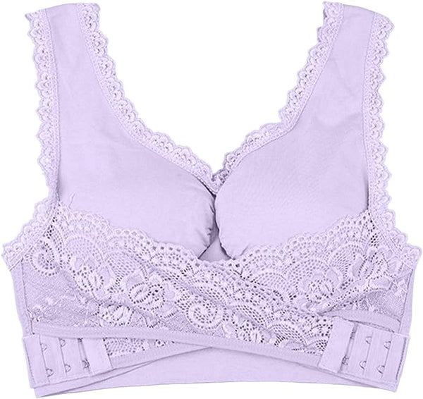 New Women Comfort Wireless Lace Lift Bra Classic Front Cross Side Buckle Yoga Sports Lace Bra, Purple, Sz 3X Fits like a 1X