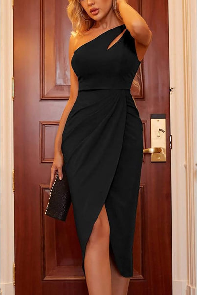 NEW Women's Sexy One Shoulder Dress Sexy Hollow Out Sleeveless Ruched Wrap Classic Midi Club Party Dress, Black, Sz XXL