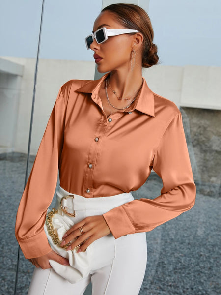 New Women's Shein Curved Hem Satin Shirt in Coral Orange! Looks & Feels like silk! Sz XL! Fits True! Rated 4.86 out of 5 stars!
