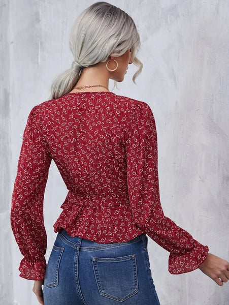 New Women's SHEIN Ditsy Floral Flounce Sleeve Wrap Knot Side Peplum Hem Blouse, Sz S!