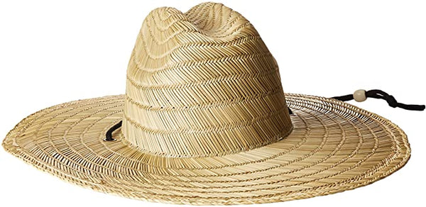 - Wide-brimmed straw hat with creased crown, adjustable chin strap, and logo patch
