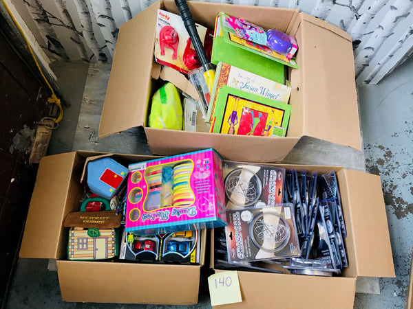 LOT 140-BOX LOT AS IS MIXED LOT TOYS, STATIONERY, HOUSEWARES, 3 BOXES 60+PC! GREAT FOR RE-SALE OR TO KEEP!