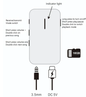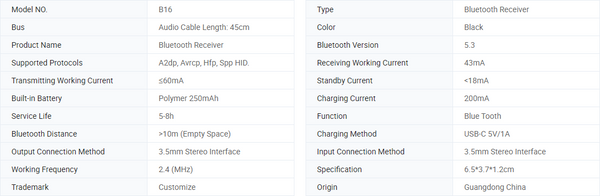 | Packing list | Bluetooth transceiver, product manual, USB power supply cable, 3.5mm audio cable |