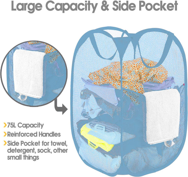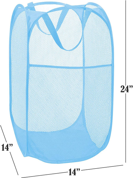 NEW BATTOO Deluxe Strong Mesh Pop up Laundry Hamper Basket with Side Pocket Foldable Hamper for Laundry Room, Bathroom, Kids Room, College Dorm or Travel Light Blue