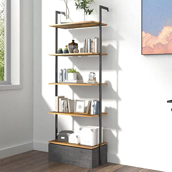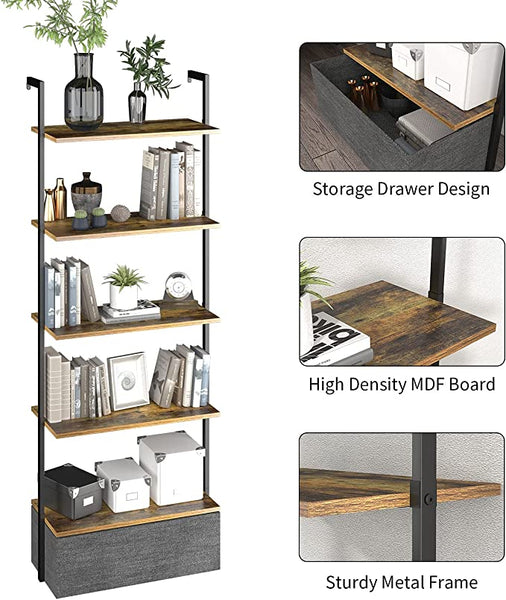 5 Tier Industrial Bookshelf with Drawers, Wall Mounted Wood Bookcase Furniture for Bedroom, Living Room, Balcony, Kitchen and Home Office, Rustic Brown