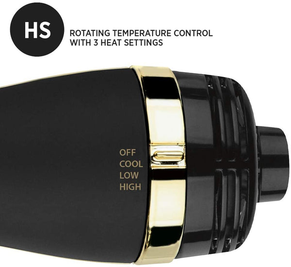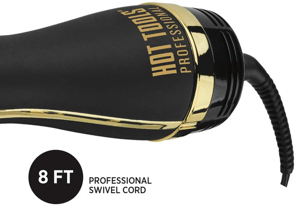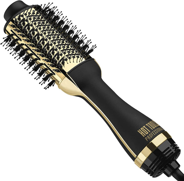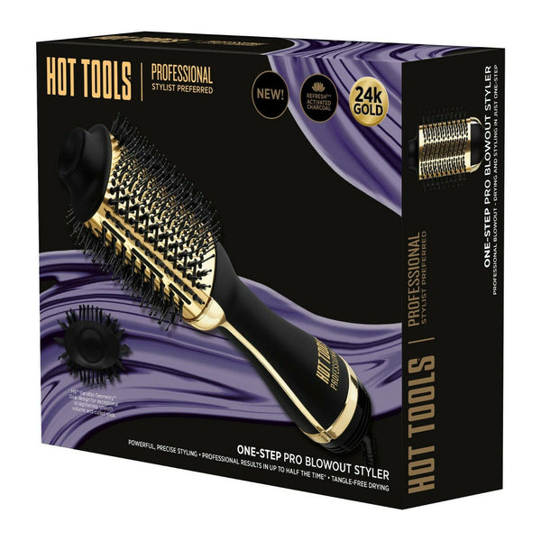 The hot tools professional 24k gold charcoal infused one-step blowout styling tool is dependable in every way. Starting with the design, the versatile oval brush design has gently curved sides created to smooth hair, while the rounded edges help craft volume from the roots down to beautifully curled ends. Just one step to gorgeous styles. A styling surface designed with our tried and trusted 24k gold technology delivers even heat distribution that’s essential to consistent results. Plus, it’s ideal for all hair types! direct ion technology helps maintain a neutral charge on the hair’s surface, leaving the hair looking conditioned and smooth, while helping reduce frizz and static for shiny, healthy-looking hair. Designed with unique airflow vents to accentuate a quick styling. Cutting edge boar tech 2 bristles complete with silk glide perfect the styling results with a silky-smooth finish. Complete with a rotating temperature control and three speed settings providing ultimate styling control. Fast styling, great results for all hair types, check. What more could you need? a comfortable styling experience! the lightweight design and soft-touch finish provide a relaxed grip. Equipped with an 8 ft. Professional cord giving you free range of movement and all the reach you need. Every plug-in counts and with an ALCI safety plug, required for all U.S. Hair dryers you’re all set. Plus, a 10-year limited warranty guarantees a professional tool and professional results! top features: professional tool for professional results. Get simple, beautiful blowouts with one tool.Styling Surface designed with the unparalleled 24k gold technology for even heat distribution and consistent results for all hair types. Charcoal-Infused bristles are perfect for refreshing 2nd day hair!Designed with an ALCI safety plug (required for U.S. Hair dryers).rotating Temperature control with 3 speed settings provides styling versatility and great results on all hair types.