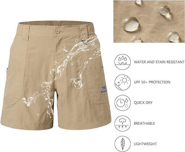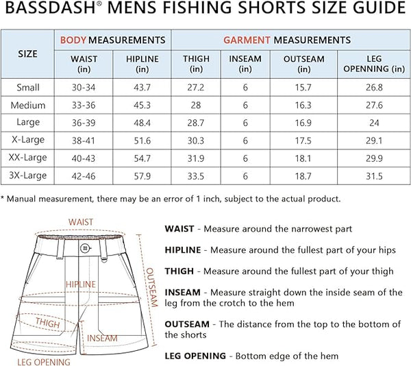 Advanced UPF 50+ in the sun protection shorts blocks 98% of the sun's harmful ultraviolet rays, so you can be active all day in the sunWith water resistant coating which can prevent absorption of liquids and reduce staining - keep your shorts dry and clean as long as possible7 convenient and durable pockets to free your hands - two front deep pockets, two front small pockets with hook-and-loop closure, two SBS zippered back pockets, and one reinforced plier pocketLoose fit design with partial elastic waist and zipper fly closure will embrace most body shapes and sizes; 6" inseam and gusseted crotch are built to improve range of motionDesigned for anglers, fishermen and outdoorsmen - these active shorts suit for daily wear, fishing, hiking, golf, travelling, or other your favorite outdoor activities